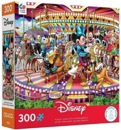 Features a vibrant illustration of Mickey and Minnie Mouse on a carousel with friends.