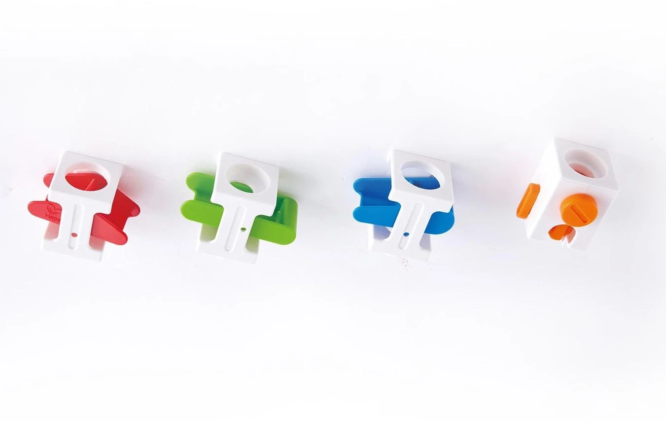 Boost the versatility– and fun – of your Quadrilla sets with this four-block pack. Includes an adjustable distributor block where you choose the marble direction and three cool types of see-saw.