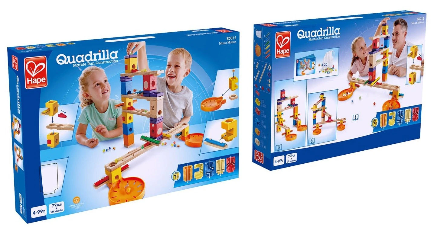 Music Motion turns up the volume on classic Quadrilla marble runs by combining strategically-placed musical chimes with wooden rails and blocks.