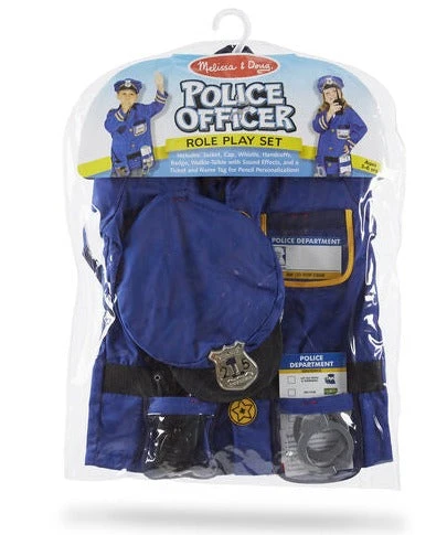 - Includes jacket, cap, whistle, handcuffs, badge, walkie-talkie with sound effects, and reusable name tag and ticket.