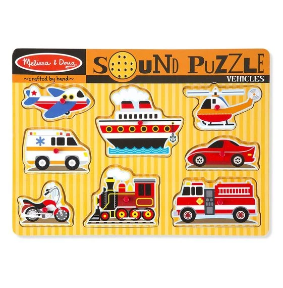 Place a vehicle puzzle piece correctly in the puzzle board and listen to it toot, beep or rumble! Eight great sounds and a full-color, matching picture beneath the eight wooden pieces.