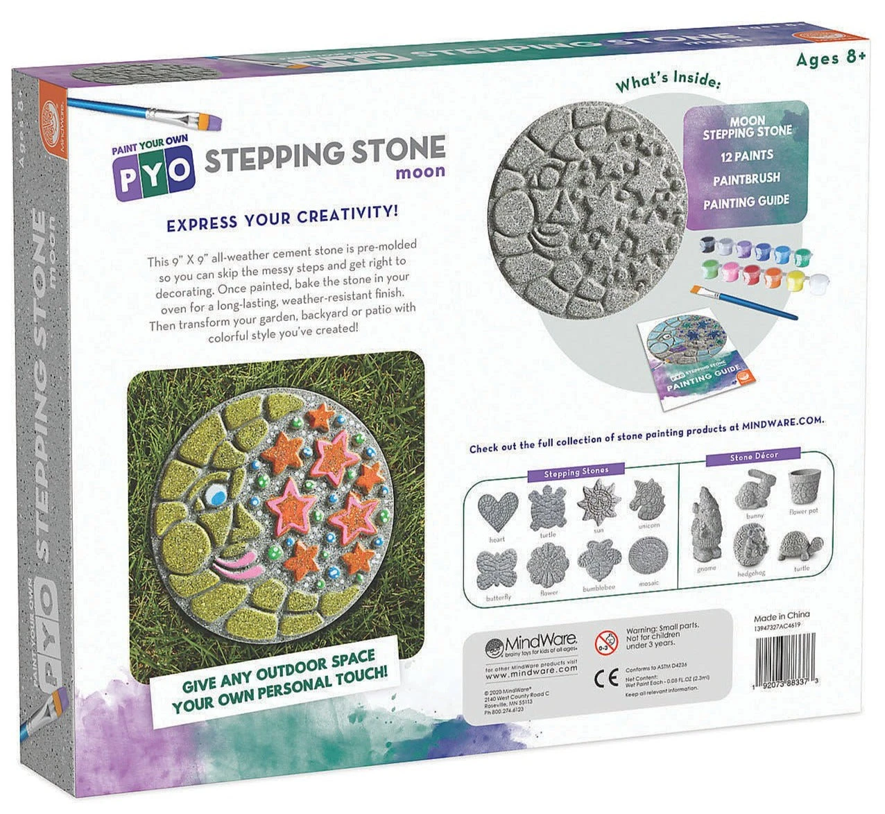 A dozen vibrant paints allow for endless creativity with Paint Your Own Stepping Stones—mix, blend and add custom color accents right out of the box – no cement mixing necessary! Once painted, bake the stone in your oven for a long-lasting, weather-resistant finish. Display this celestial stepping stone or make a whole pathway of colorful designs to transform your garden, backyard or patio!