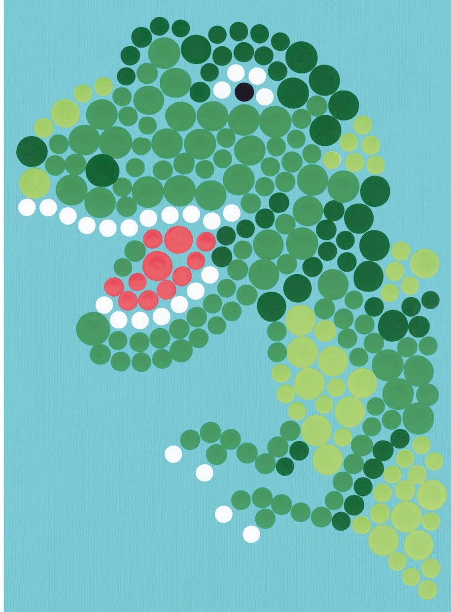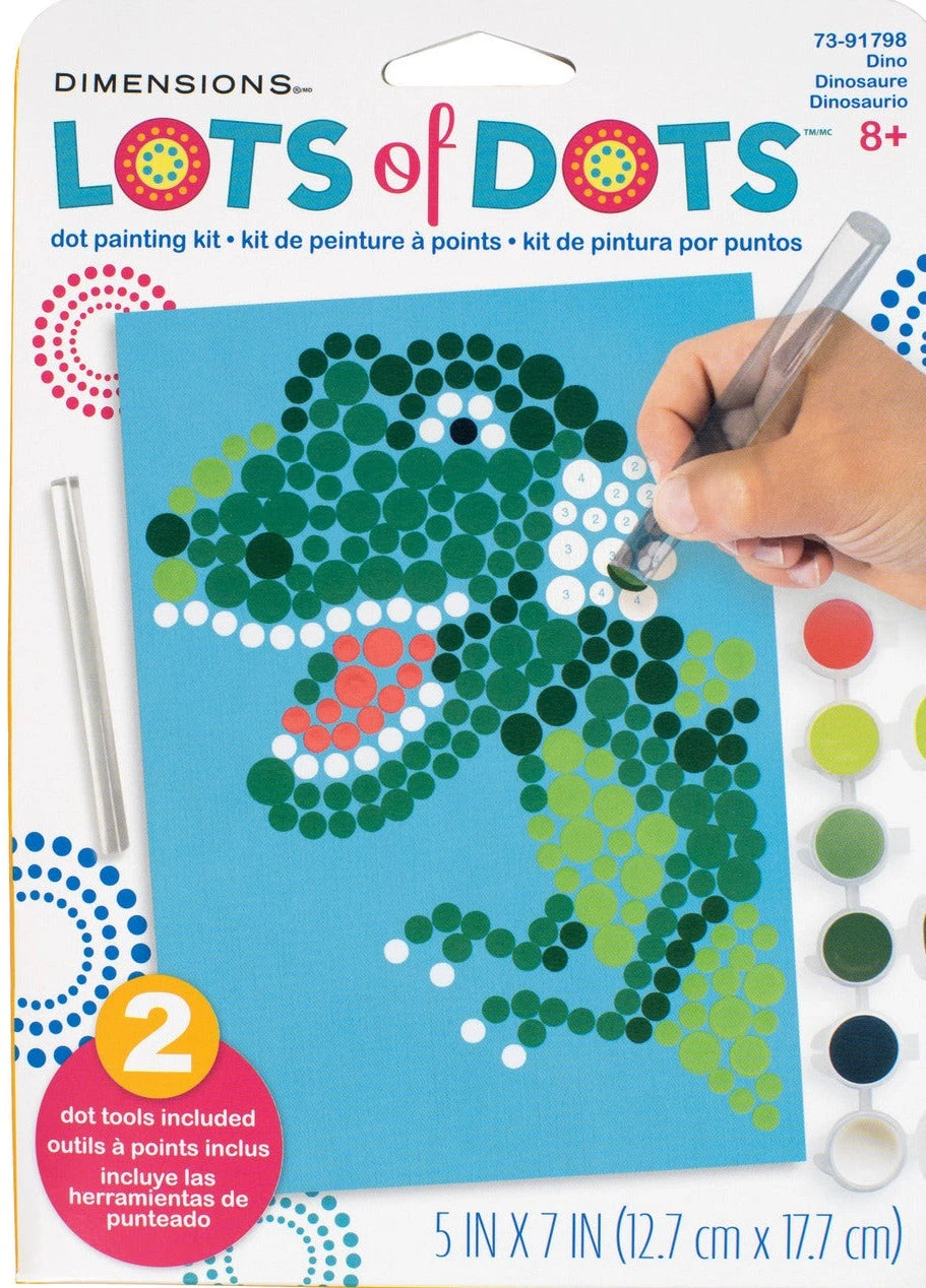 Dot painting is easy and fun- perfect for beginners! This cool Dino by Dimensions provides a unique alternative to traditional paint-by-number. Simply match each dot painting tool to the same size circle on the board and dot away! For ages 8 and up.