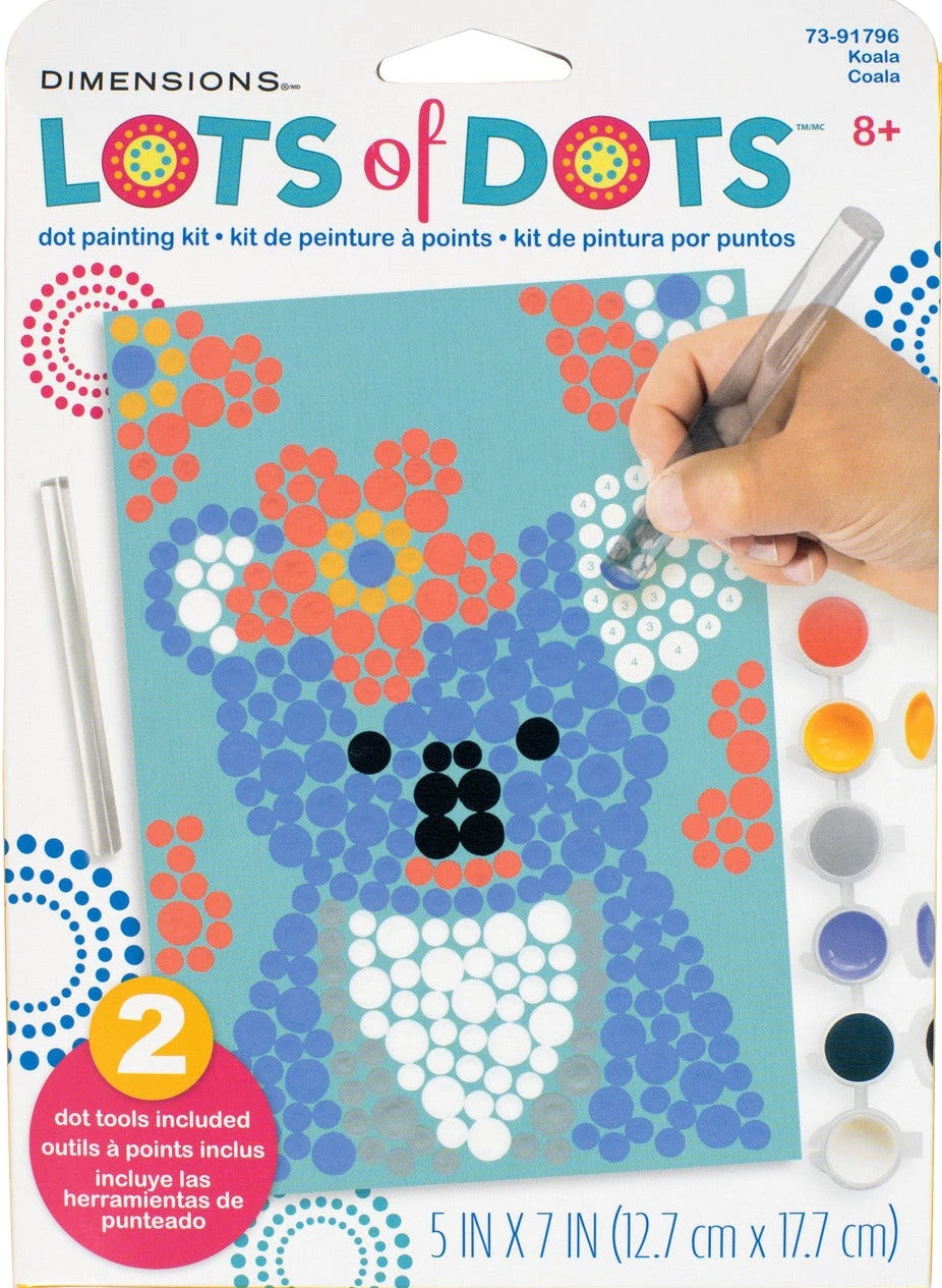 Dot painting is easy and fun – perfect for beginners! This cute Koala by Dimensions provides a unique alternative to traditional paint-by-number. Simply match each dot painting tool to the same size circle on the board and dot away! For ages 8 and up.