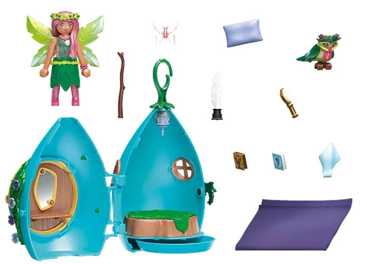 In the mystical forest, the Forest Fairies and their soul animals feel especially at home. This enchanting Forest Fairy and her beloved companion, the leafy owl, call a cozy Fairy Hut their home. When it’s time to go to sleep, the fairy combs her hair in front of the mirror, takes off her leafy skirt and slips into her warm bed of leaves. The small flower lamp above the bed provides light. Now it’s time to close the door and off to the land of dreams. The playset consists of a Forest Fairy with a leafy owl soul animal, a Fairy Hut with lockable door and glowing flower lantern, a sticker sheet with glittering star stickers and many other enchanting extras. Leaf skirt and belt can be removed. The Fairy Hut can be hung in the children’s room or on the Fairy Community Tree.