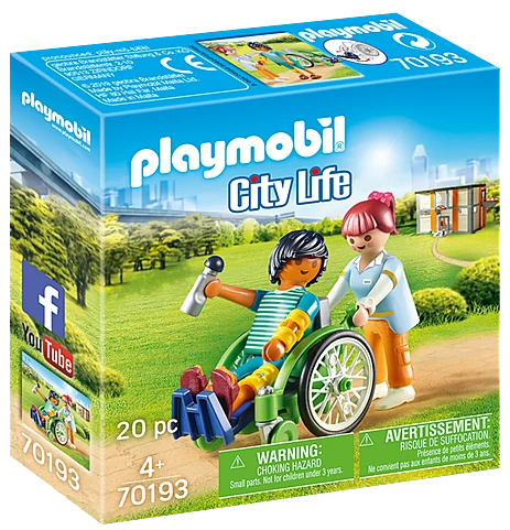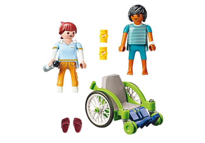 Figures: 1 nurse, 1 man Animals: none Accessories: 1 wheelchair, 2 splint bandages, 1 pair of patient shoes, 1 water bottle