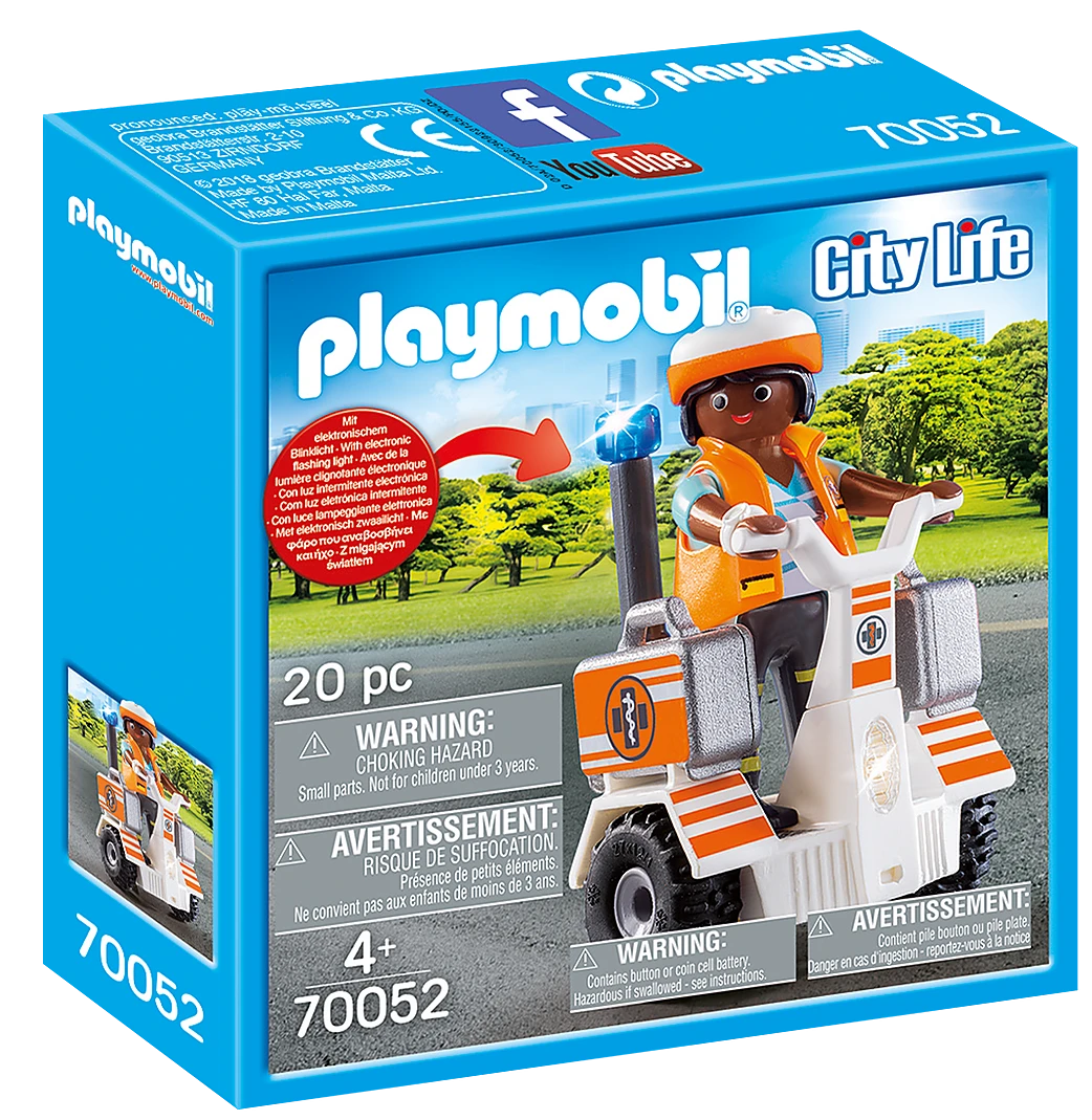 Figures: 1 female paramedic Accessories: 1 balance roller with flashing light, 1 doctor’s case, 1 resuscitator bag, 2 infusion bandages, 1 set of surgical instruments, 1 helmet