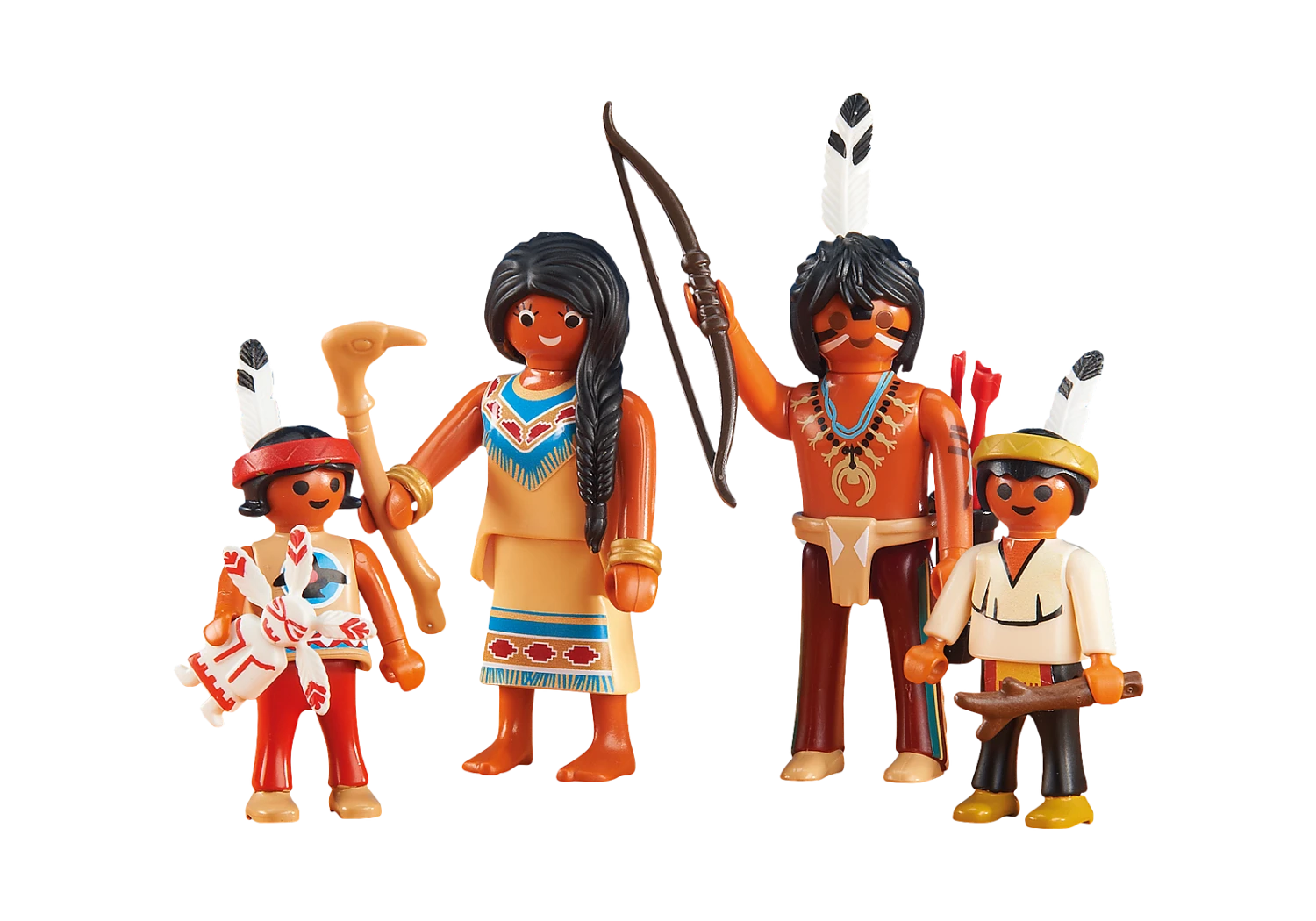 Figures: Native American family 1 man, 1 woman, 1 girl, 1 boy, Accessories: 1 bow, 1 quiver, 2 arrows, 1 loincloth, 2 children’s headdress with feathers, 1 feather, 1 doll, 1 stick, 1 stick