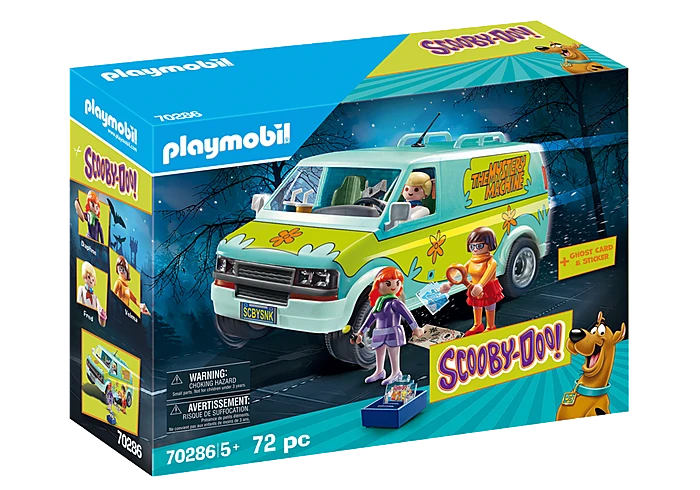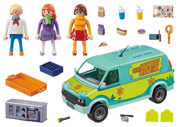 Figures: One Fred Jones, one Daphne Blake, one Velma Dinkley Accessories: 1 vehicle “Mystery Machine”, 1 monitor block, 3 “ghost cards”, 1 card index box with insert, 1 box, 1 GPS device, 1 flashlight, 1 magnifying glass, 1 camera with cord, 1 map, 2 drinking cups, 1 hot dog, 1 piece of pizza, 1 donut, 2 tetra-packs