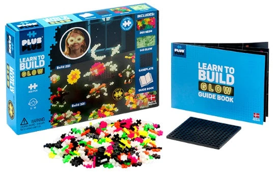 The Plus-Plus Learn To Build set contains everything you need to get started with this unique construction toy. A Guide Book gives step-by-step instructions to build flat mosaics and 3D creations – animals, people, buildings and more using Glow in the Dark pieces!