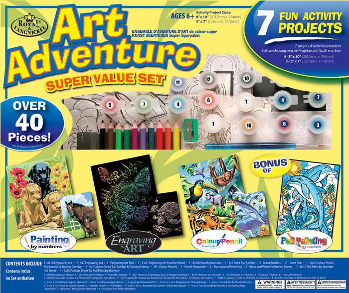 Start your Art Adventure® with this 7 project box set of Royal & Langnickel’s most popular products. Each box contains 5″ x 7″ and 8″ x 10″ Engraving Art™ designs, Painting by Numbers™ designs and Colour Pencil by Numbers™ designs with a bonus Foil Painting by Numbers™ design.