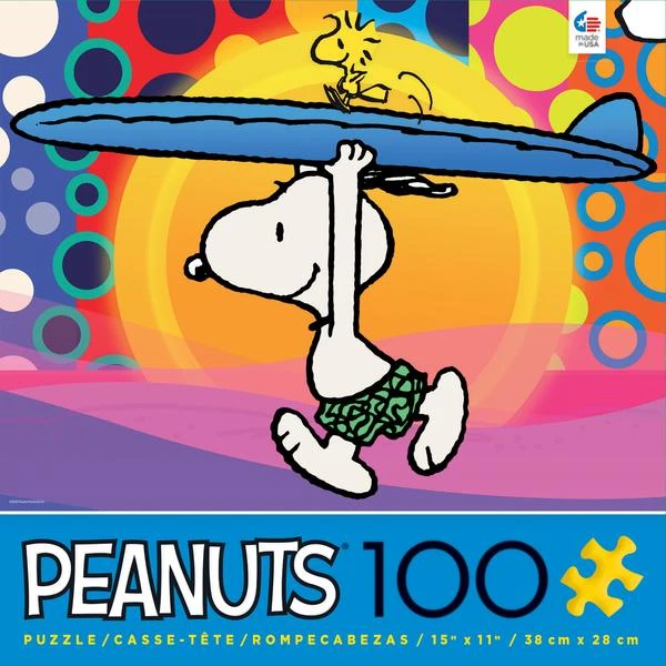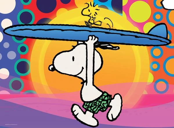 Features Snoopy from the Peanuts cartoon. He is carrying a surf board above his head.