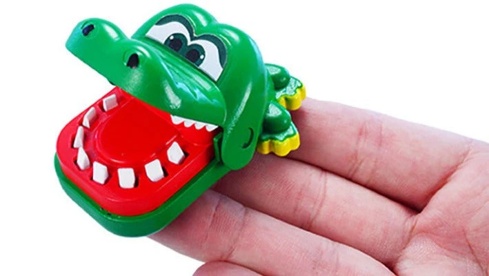 The world’s smallest version of the popular game of nerves and luck. Open the Croc’s mouth wide, and “examine” his teeth by pressing down on them one by one. But watch out! Be the player to press on the crocodile’s sore tooth and you’ll get chomped!